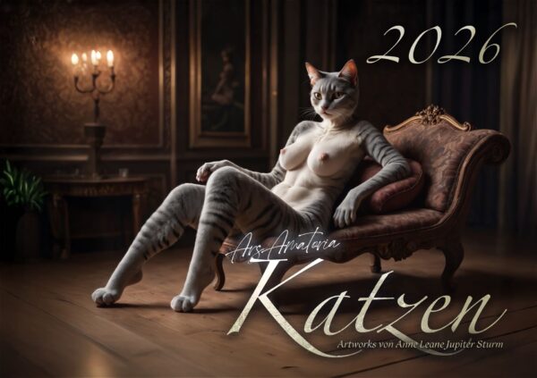 Anthropomorphe Katzen posieren lasziv und lustvoll in höfischen Gemächern und begleiten Dich durch das neue Jahr 2026.